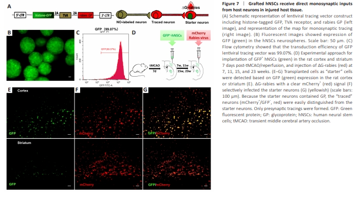To analyze whether grafted neurons form connections with host neurons, a retrograde transsynaptic tracing strategy with ?G-rabies was used (Callaway and Luo, 2015). The hNSCs were stably transduced with the lentiviral tracing vector, which expressed a histone-tagged GFP, the TVA receptor necessary for selective infection with ?G-rabies, and rabies GP to allow for transsynaptic spread. The ?G-rabies with the foreign coat protein EnvA, in which the gene mCherry replaced the gene for GP in the viral genome, infected only the cells with the TVA receptor (Figure 7A). Fluorescence imaging (Figure 7B) showed that GFP containing lentiviral tracing vector transduced hNSCs with a transduction efficiency of 99.07% (Figure 7C). After 7 days post-tMCAO/R, rats were implanted with GFP-transduced hNSCs adjacent to the injury in thecortex or striatum (Figure 7D). Grafted hNSCs expressing nuclear GFP were identified as starter neurons (Figure 7E). After infection by ?G-rabies (Figure 7D), the targeted neurons were visualized by expression of GFP and mCherry (Figure 7F and G). In contrast, presynaptic traced neurons were identified by mCherry expression without GFP (Figure 7G).