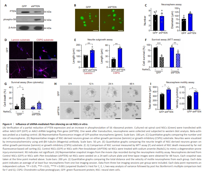 Having confirmed that the complete Pten deletion using a transgenic mouse line could increase the survival and potentially enhance the neurite growth from the grafted NSCs, we wanted to examine if partial suppression of Pten gene using an RNA inhibition approach may also produce similar benefits. To decrease the level of PTEN expression, NSCs obtained from E14 rat embryonic spinal cords were transfected with AAV2 expressing short hairpin RNA (shRNA) targeting Pten gene. We confirmed a substantial but partial reduction in the expression of PTEN protein in rat NSCs treated with AAV2-shPTENGFP compared to that in NSCs transduced with control AAV2-GFP (Figure 4A). Pten knockdown also led to phosphorylation of S6 ribosomal protein (Figure 4A), indicating activation of mTOR downstream signaling pathway by Pten silencing. At 7 days after treatment of AAVs, there was no significant difference in the number of neurospheres obtained from NSCs with and without Pten knockdown (Figure 4B and C). There was a tendency of NSCs with Pten knockdown to form bigger neurospheres compared to control NSCs. However, there was no statistical significance between the two conditions (Figure 4B and C). Neurite outgrowth from the NSC-derived neurons was examined following shRNA-mediated Pten silencing. Transfected NSCs were seeded on laminin or CSPG-coated coverslips. We assessed the extent of neurite elongation from βIII tubulin-positive neurons differentiated from NSCs at 7 days after plating. Pten suppression by shRNA targeting Pten gene enhanced neurite outgrowth by more than 1.5 folds above the control level on laminin substrate (Figure 4D and E). Pten knockdown promoted neurite growth more potently (by 2.5 folds) on inhibitory CSPG-coated surfaces (Figure 4D and E).We further elucidated the effects of PTEN suppression on NSC survival. In MTT cell survival assay, treatment with NaAsO? reduced cell survival by almost 50% in control NSCs. Pten knockdown partially attenuated NaAsO2-induced decrease in cell survival (44.9 ± 5.6 vs. 60.3 ± 9.5 in AAV-Cre and AAV-shPTEN NSCs, respectively) (Figure 4F). However, the effect of Pten knockdown on cell survival was not statistically significant by two-way ANOVA (F(1,12) = 1.752, P = 0.21). NaAsO2 treatment significantly increased the fraction of brightly stained dead cells in the control AAV2-GFP group evaluated by a flow cytometric analysis. Pten knockdown diminished the dead cell fraction (20.9% ± 5.4% vs. 11.0% ± 1.4%), and the effect of NaAsO? treatment on the percentage of dying NSCs became non-significant in NSCs with AAV2-shPTEN (P = 0.25 by two-way ANOVA followed by Bonferroni’s post hoc analysis; Figure 4G). Since we observed an increase in the extent of rostrocaudal migration of mouse NSCs with Pten deletion, we examined the influence of Pten suppression on the motility of NSCs. Our previous study reported IGF-1 signaling-dependent motility of cultured neurospheres (Hwang et al., 2018). Consistent with the report, NSCs transduced with control AAV2-GFP exhibited dynamic changes in their position and outer morphology accompanied by the creation of daughter neurospheres during the 48-hour live imaging session (Figure 4H and Additional Movie 1). Pten knockdown in NSCs led to a higher degree of neurosphere movement with more frequent splitting into daughter neurospheres (Figure 4H and Additional Movie 2). Quantification revealed a significant increase in the total distance and velocity of cultured neurospheres by transduction of AAV2-shPTEN (Figure 4I), indicating that the suppression of Pten may promote the NSC motility and potentially enhance the migratory behavior.