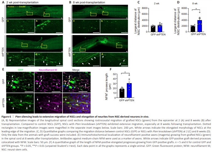 Since we observed an increase in NSC motility by Pten knockdown in vitro, we measured the longest distance of grafted NSC migration in the injured spinal cord. At 2 weeks post-transplantation, the extent of the rostrocaudal distribution of control NSCs was approximately 2 mm (Figure 6A). NSCs with Pten knockdown seemed to move further in the rostrocaudal direction, but the average longest migration distance was not significantly different (Figure 6A and C). However, GFP-positive NSCs were positioned in a direction aligned with the rostrocaudal direction of the spinal cord. Furthermore, individual NSCs with shPTEN were of a more elongated morphology than that of wildtype NSCs (Figure 6A). At 8 weeks post-transplantation, the rostrocaudal distribution of the small number of surviving control NSCs was almost the same as the distance at 2 weeks, suggesting that NSCs did not migrate significantly between these two time points (Figure 6B and D). In contrast, NSCs with shPTEN exhibited substantially more extensive distribution in the rostrocaudal direction, showing that the average migration distance was significantly higher than that of control NSCs (Figure 6B and D). Intriguingly, GFP-positive NSCs transduced with AAV2-shPTEN, but not AAV2-GFP, frequently exhibited highly elongated morphology with parallelly running cytoplasmic processes at the leading edge of migration (Figure 6B). The average length of neurofilament positive processes derived from GFP-positive cells was markedly higher in animals transplanted with NSCs with Pten knockdown (Figure 6E and F), suggesting that PTEN suppression promoted neurite elongation from NSC-derived neurons. There was no evidence of tumor formation in all 38 animals transplanted with either control NSCs or NSCs with Pten knockdown. Two recipients of NSCs with Pten knockdown were allowed to survive up to 9 months following transplantation and neither one developed tumor at the graft site.