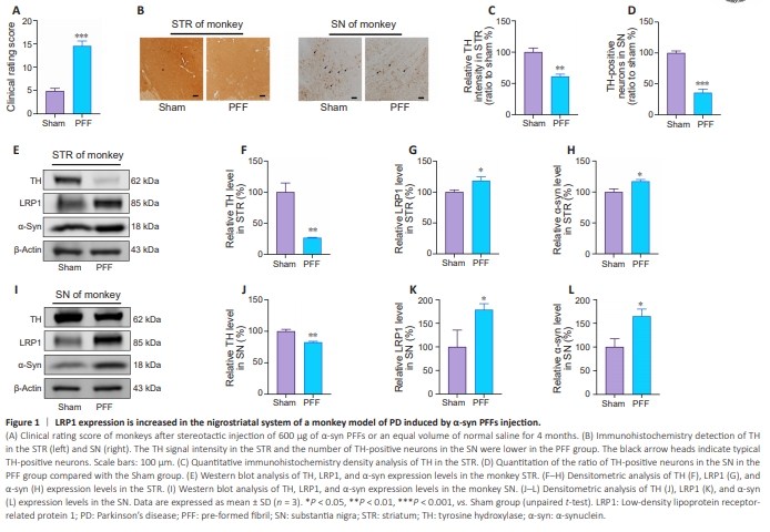 Figure 1 | LRP1 expression is increased in the nigrostriatal system of a monkey model of PD induced by α-syn PFFs injection.