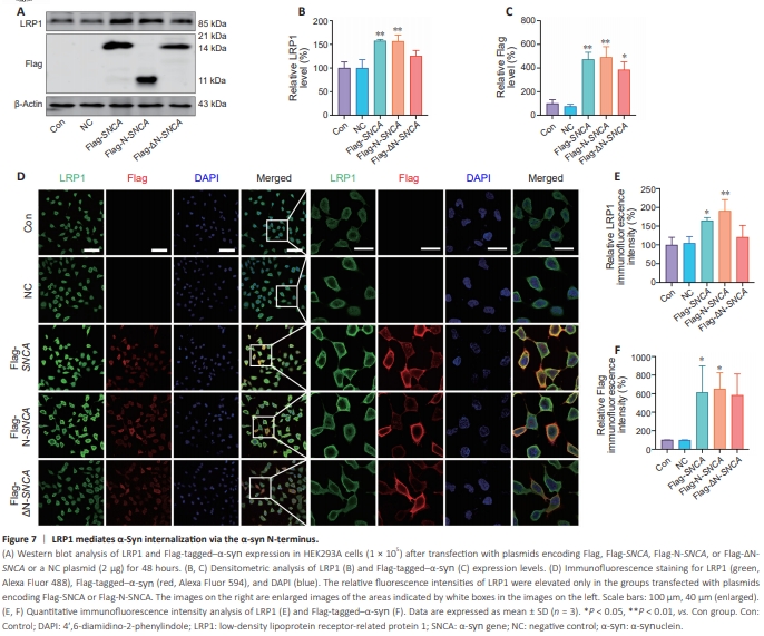α-Syn protein contains three functional regions: the N-terminus, the NAC domain, and the C-terminus. To determine which region of α-syn is necessary for its LRP1-mediated internalization, HEK293A cells were transfected with plasmids encoding Flag, Flag-SNCA, Flag-N-SNCA, or Flag-ΔN-SNCA, or a NC plasmid, for 48 hours, and Flag-tagged–α-syn and LRP1 levels were determined by western blot (Figure 7A–C) and immunofluorescence (Figure 7D–F). LRP1 levels were significantly elevated in the cells transfected with plasmids encoding Flag-SNCA (P < 0.01 for the western blot results, P < 0.05 for the immunohistochemistry results) or Flag-N-SNCA (P < 0.01 for both the western blot and immunohistochemistry results), whereas no obvious changes were detected in the Flag-ΔN-SNCA group, indicating that the α-syn N-terminus is essential for LRP1-mediated α-syn internalization.