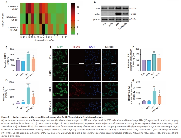 Heat maps of amino acid proportions in the different regions of α-syn showed that the lysine content was significantly higher in the N-terminus (18.33%) than in the NAC domain (2.86%) and C terminus (6.67%) (Figure 8A). To determine whether LRP1 interacts with α-syn through these lysine residues, α-syn PFFs were treated with NHS to cap the lysine residues. Western blot and immunofluorescence analyses demonstrated that, compared with the PFF group, capping the lysine residues there significantly suppressed LRP1 (P < 0.05 for both the western blot and immunohistochemistry results) and intracellular α-syn levels (P < 0.01 for the western blot results, P < 0.05 for the immunohistochemistry results) (Figure 8B–G). These results show that capping the lysine residues in α-syn PFFs effectively decreased α-syn and LRP1 expression in PC12 cells, indicating that lysine residues play a key role in LRP1- mediated α-syn uptake and transmission. Accordingly, we conclude that LRP1 mediates α-syn internalization via its N-terminal lysine residues.