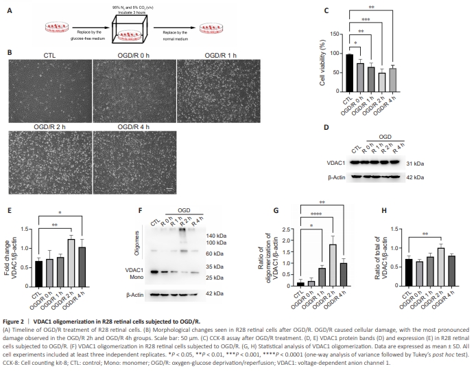 To explore the potential association between PANoptosis and VDAC1 oligomerization, we first investigate the status of VDAC1 oligomerization in R28 retinal cells subjected to OGD/R (Figure 2A). In contrast to the control group, cell injury was detected in the OGD/R group (Figure 2B). The CCK8 assay results also showed that cell viability was decreased in the OGD/R group compared with the control group, especially at 2 hours (Figure 2C). Next, we analyzed VDAC1 expression and oligomerization using ethylene glycol bis (succinimidyl succinate), a chemical cross-linker. VADC1 expression was increased 2–4 hours following OGD/R, especially at 2 hours compared with control group (Figure 2D and E). In addition, an increase in VDAC1 oligomerization was observed at 2 hours in the OGD/R group compared with control group (Figure 2F–H).