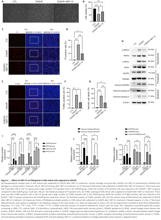 VBIT-12, a potent VDAC1 oligomerization inhibitor, was used to investigate the role of VDAC1 oligomerization in an in vitro model of retinal I/R injury (Verma et al., 2022). As shown in Figure 4A, VBIT-12 treatment suppressed OGD/R-induced injury to R28 retinal cells. CCK-8 assay verified that inhibiting VDAC1 oligomerization protected R28 retinal cells from OGD/R-induced injury (Figure 4B). Next we assessed the effect of VBIT-12 treatment on RCD using PI and TUNEL staining. A decreased proportion of PI-positive cells was observed in the VBIT-12-treated groups compared with the OGD/R group (Figure 4C and D). In addition, VBIT-12 treatment suppressed apoptosis in the VBIT-12-treated groups, as indicated by TUNEL staining (Figure 4E and F). Furthermore, LDH-release assay verified that VBIT-12 protected against OGD/ R-induced necrotic cell death (Figure 4G). Next we assessed activation of the three types of cell death signaling cascades by detecting expression changes in their key regulators. Increased RIPK3 and MLKL expression and phosphorylation (key events for the activation and execution of necroptosis (Zhan et al., 2021)) were detected in R28 retinal cells subjected to OGD/R compared with control group, while VBIT12 treatment reduced RIPK3 and MLKL phosphorylation (Figure 4H and I). OGD/R also elevated NLRP3 expression and GSDMD cleavage (key events for the activation and execution of pyroptosis (Shi et al., 2015)) compared with control group, while VBIT-12 treatment attenuated these trends (Figure 4H and J). Furthermore, VBIT-12 treatment reduced the increase in cleaved-caspase-8 and cleaved-caspase-3 (key events for the activation and execution of apoptosis (Yan et al., 2023)) induced by OGD/R compared with control group (Figure 4H and K). Collectively, these results demonstrated an important role for VDAC1 oligomerization in regulating PANoptosis in R28 retinal cells subjected to OGD/R.