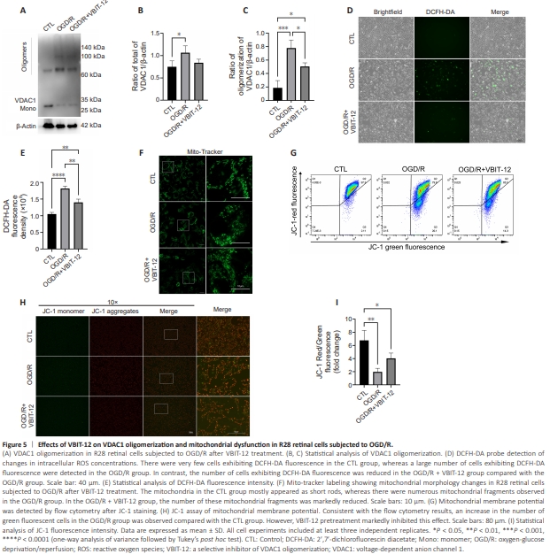 Figure 5 | Effects of VBIT-12 on VDAC1 oligomerization and mitochondrial dysfunction in R28 retinal cells subjected to OGD/R.
