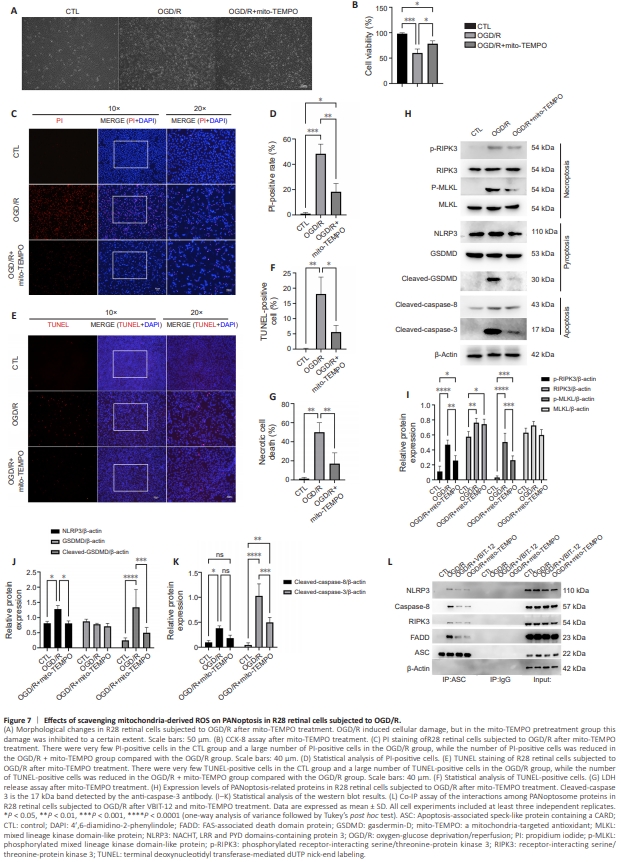 Figure 7 | Effects of scavenging mitochondria-derived ROS on PANoptosis in R28 retinal cells subjected to OGD/R.