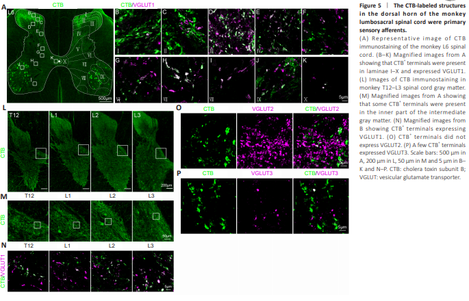 Figure 5 | The CTB-labeled structures in the dorsal horn of the monkey lumbosacral spinal cord were primary sensory afferents.