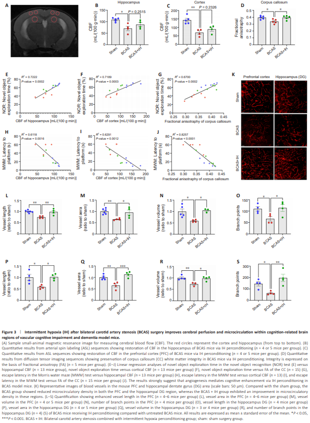 Figure 3 | Intermittent hypoxia (IH) after bilateral carotid artery stenosis (BCAS) surgery improves cerebral perfusion and microcirculation within cognition-related brain regions of vascular cognitive impairment and dementia model mice.