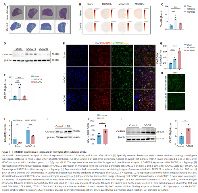 We and others have recently performed spatial transcriptomic sequencing of ischemic brain tissue collected from MCAO mice (Li et al., 2023a; Han et al., 2024). After reanalyzing the published data, we found that Card19 expression was markedly increased in microglia 3 hours and 12 hours after MCAO compared with the sham group. Notably, the spatial transcriptomic results showed that the elevated Card19 expression was mainly distributed in the ischemic penumbra (Figure 3A and B). qPCR and western blotting confirmed that Card19 mRNA and protein levels were significantly increased in the ischemic penumbra at 1 and 3 days after MCAO (Figure 3C–E). Furthermore, immunofluorescence staining showed that compared with the sham group, microglial CARD19 expression was increased 1 and 3 days after MCAO (Figure 3F and G). To determine whether microglia were responsible for the elevated Card19 expression levels, mice were fed 8 g feed containing PLX5622 (a CSF1R inhibitor) daily for 2 weeks to deplete microglia. The efficiency of microglial depletion was verified by immunofluorescence staining (Figure 3H). The results showed that, the elevated Card19 mRNA levels observed after MCAO decreased significantly to physiological levels after microglia depletion (MCAO1d + Vehicle vs. MCAO1d + PLX5622, P = 0.0081), indicating that the increased CARD19 expression seen after MCAO was mainly derived from microglia (Figure 3I). Since DAMPs can act on microglial Toll-like receptors to initiate a proinflammatory response after ischemic stroke, we stimulated cells with LPS in vitro to mimic microglial activation during the acute phase of ischemic stroke. The results showed that treating primary microglia with LPS increased CARD19 expression compared with the control group (Figure 3J and K). Moreover, when oxygen–glucose deprivation/reoxygenation (OGD/R) was applied to microglia to mimic oxygen and energy deficiency after ischemic stroke, CARD19e protein levels increased compared with the control group (Figure 3L). Taken together, these findings suggest that microglial CARD19 expression increases in the penumbra after ischemic stroke.