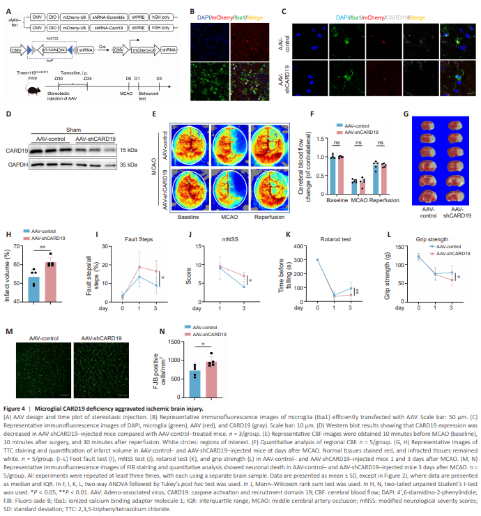 To investigate the role of microglial CARD19 in ischemic stroke, we conditionally knocked down Card19 expression in microglia through stereotaxic injection of AAVs into the cerebral cortex of Tmem119Cre/ERT2 mice (Figure 4A). Immunofluorescence staining showed that microglia were efficiently transfected, and CARD19 knockdown was successful (Figure 4B– D and Additional Figure 1D–F). Co-staining for AAV and other cell types showed that the majority of AAV co-localized with microglia, while only a minimal amount of AAV was detected in astrocytes. There was no significant co-localization of AAV with endothelial cells (CD31) or neurons (NeuN) (Additional Figure 1A–C). These findings suggested that AAV transfected microglia and specifically knocked down CARD19. Next, mice in the AAVcontrol group and AAV-shCARD19 group were subjected to MCAO. There are no significant differences in regional CBF between AAV-control and AAVshCARD19 mice at minutes before MCAO (baseline), 10 minutes after surgery, or 30 minutes after reperfusion (Figure 4E and F). TTC staining showed that the infarct volume of AAV-shCARD19 mice was larger than that of AAV-control mice (Figure 4G and H). A series of behavioral tests (foot fault test, mNSS test, rotarod test, and grip strength test) showed that the AAV-shCARD19 mice exhibited more severe neurological deficits than the AAV-control mice (Figure 4I–L). Fluoro-Jade B staining showed that more neurons died in AAVshCARD19 mice than in AAV-control mice (Figure 4M and N). These results suggested that conditional knockdown of CARD19 in the microglia aggravates brain injury after ischemic stroke.