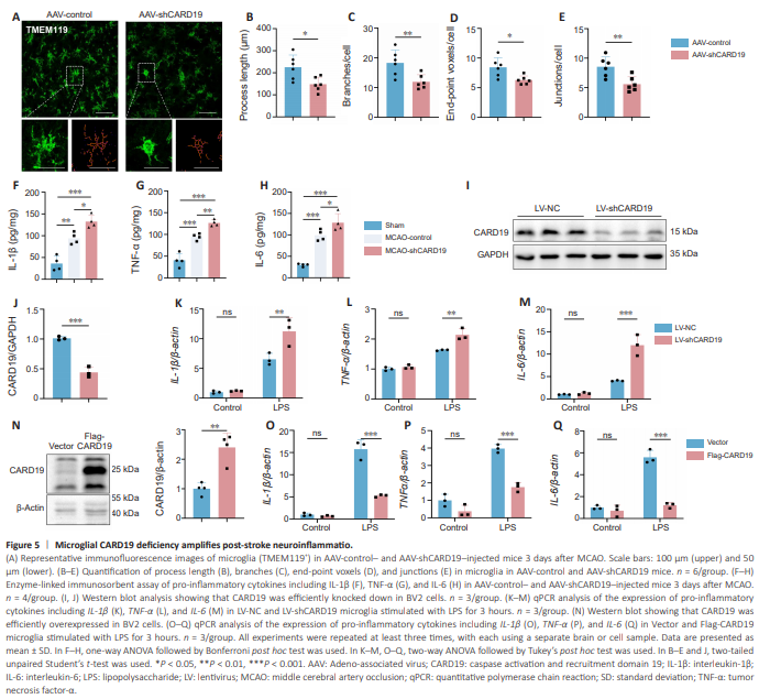Since microglia plays a pro-inflammatory role during the acute phase of ischemic stroke, we next asked whether microglial CARD19 deficiency affects neuroinflammation post-stroke. Homeostatic microglia have small cell bodies and ramified branches. After ischemic stroke, microglia are activated rapidly and adopt an amoeboid-like phenotype (Jia et al., 2021). We therefore observed microglial morphology in the ischemic penumbra by TMEM119 immunofluorescence staining. Microglia in the AAV-shCARD19 mice exhibited larger cell bodies and shorter and less ramified branches than microglia in the AAV-control mice on the 3rd day after MCAO (AAV-control vs. AAV-shCARD19: process length, P = 0.0150; branches, P = 0.0099; end-point voxels, P = 0.0129; junctions, P = 0.0060; Figure 5A–E). Furthermore, compared with AAVcontrol mice, AAV-shCARD19 mice exhibited higher levels of pro-inflammatory factors, including IL-1β, TNF-α, and IL-6 (IL-1β: Sham vs. MCAO-control, P = 0.0011; Sham vs. MCAO-shCARD19, P < 0.0001; MCAO-control vs. MCAOshCARD19, P = 0.0142; TNF-α: Sham vs. MCAO-control, P = 0.0002; Sham vs. MCAO-shCARD19, P < 0.0001; MCAO-control vs. MCAO-shCARD19, P = 0.0066; IL-6: Sham vs. MCAO-control, P = 0.0002; Sham vs. MCAO-shCARD19, P < 0.0001; MCAO-control vs. MCAO-shCARD19, P = 0.0435; Figure 5F–H). To further investigate the role of CARD19 in microglia, we knocked down or overexpressed CARD19 in BV2 cells using lentiviruses (Figure 5I and J) and found that the levels of IL-1β, TNF-α, and IL-6 mRNA in LV-shCARD19-treated microglia were significantly higher than those in LV-NC-treated microglia after LPS stimulation (IL-1β/β-actin: LV-NC + LPS vs. LV-shCARD19 + LPS, P = 0.0074; TNF-α/β-actin: LV-NC + LPS vs. LV-shCARD19 + LPS, P = 0.0020; IL-6/β-actin: P = 0.0002; Figure 5K–M). Consistent with this, CARD19 overexpression suppressed IL-1β, TNF-α, and IL-6 mRNA levels after LPS stimulation (Figure 5N–Q). Thus, CARD19 deficiency promotes microglial activation and amplifies neuroinflammation in ischemic stroke.