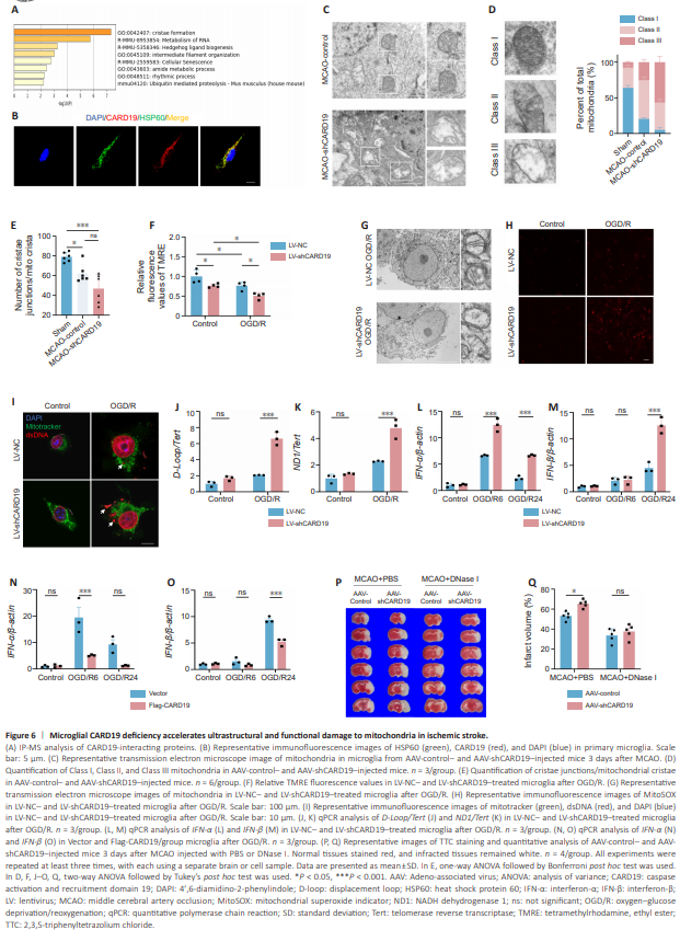 To investigate the mechanism underlying the neuroprotective role of microglial CARD19, we screened for CARD19-interacting proteins by immunoprecipitation-mass spectrometry. The proteins that interacted with CARD19 in microglia were enriched in the mitochondrial cristae formation pathway (Figure 6A). Immunofluorescence staining confirmed that CARD19 co-localized with HSP60 (a marker of mitochondria) in primary microglia (Pearson’s_Rr = 0.84222891), indicating that CARD19 may play a functional role in the mitochondria of microglia (Figure 6B and Additional Figure 2). When ischemic stroke occurs, cerebral blood flow is blocked, resulting in microglial mitochondria dysfunction, which manifests as reduced ATP production, energy metabolism disorders, and mitochondrial structural damage (Li et al., 2014; Yang et al., 2018). To investigate the role of CARD19 in the maintenance of mitochondrial cristae in microglia, the mitochondrial ultrastructure of microglia in the ischemic penumbra on day 3 after MCAO was observed by transmission electron microscopy (Figure 6C). Our results showed that, after MCAO, the proportion of Class I mitochondria was significantly reduced from 60%–70% to 20%, that of Class II mitochondria was significantly increased from 20%–30% to 50%–60%, and that of Class III mitochondria was significantly increased from 10% to 20%–30% compared with sham controls (Sham vs. MCAO-control: Class I, P < 0.0001; Class II, P < 0.0001; Class III: P < 0.0001). However, the proportion of Class I mitochondria was significantly reduced to around 10%, that of Class II mitochondria was reduced 30%–40%, and that of Class III mitochondria was increased to 50%–70% in AAV-shCARD19-treated mice compared with AAV-control-treated MCAO mice (MCAO-control vs. MCAO-shCARD19: Class I, P = 0.0079; Class II, P = 0.0050; Class III: P < 0.0001; Figure 6D). Additionally, after MCAO, the ratio of cristae junctions/mitochondrial cristae was decreased in AAVshCARD19-treated mice compared with AAV-control-treated mice, suggesting an increasing in cristae disintegration (Sham vs. MCAO-control, P = 0.0361; Sham vs. MCAO-shCARD19, P = 0.0002; MCAO-control vs. MCAO-shCARD19, P = 0.0539; Figure 6E). Moreover, the results from electron microscopy analysis of OGD/R-treated microglia cells were consistent with those obtained in mice (Figure 6G). These findings suggest that microglial CARD19 deficiency exacerbates mitochondrial structural damage after ischemic stroke. After ischemic stroke, hypoxia induces decoupling of the mitochondrial respiratory chain, leading to a surge in superoxide ROS production in mitochondria, as well as a decline in the mitochondrial membrane potential (An et al., 2021). Mitochondrial oxidative stress subsequently disrupts mtDNA integrity and promotes the release of oxidized mtDNA into the cytoplasm (Kim et al., 2023). Therefore, we examined relevant indicators of mitochondrial dysfunction. Compared with LV-NC-treated microglia, mitochondrial ROS production and mtDNA release were increased in the LV-shCARD19 group (D-Loop/Tert: LV-NC + OGD/R vs. LV-shCARD19 + OGD/R, P < 0.0001; ND1/ Tert: LV-NC + OGD/R vs. LV-shCARD19 + OGD/R, P = 0.0003; Figure 6H–K). In addition, the mitochondrial membrane potential was decreased in LVshCARD19-treated mice compared with LV-NC-treated microglia (LV-NC + Control vs. LV-shCARD19 + Control, P = 0.0393; LV-NC + Control vs. LVNC + OGD/R, P = 0.0404; LV-shCARD19 + Control vs. LV-shCARD19 + OGD/ R, P = 0.0255; LV-NC + OGD/R vs. LV-shCARD19 + OGD/R, P = 0.0248; Figure 6F). These findings suggest that microglial CARD19 deficiency inhibits mitochondrial function under OGD/R conditions. Previous studies have shown that disruption of mitochondrial cristae leads to mtDNA release and mtDNA-dependent interferon I responses (He et al., 2022). To determine whether microglial CARD19 deficiency–induced mtDNA release activates the IFN-I response, we examined IFN-α and IFN-β mRNA levels by qPCR and found that CARD19 knockdown boosted the OGD/R-induced increase in IFN-α and IFN-β expression (Figure 6L and M). Conversely, CARD19 overexpression abolished the OGD/R-induced IFN-I response (Figure 6N and O). Next, we depleted cytoplasmic mtDNA by intraperitoneal injection of DNase I. TTC staining showed that mtDNA clearance partially reversed the adverse outcomes caused by microglial CARD19 deficiency (Figure 6P and Q). These results suggested that microglial CARD19 deficiency aggravates brain injury by promoting mitochondrial damage and provoking mtDNA-dependent interferon I responses.