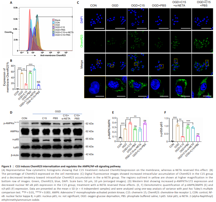 To test this, we treated BV2 cells with C15 and α-NETA (a competitive inhibitor of ChemR23) prior to subjecting the cells to OGD and quantified membrane ChemR23 expression by cytometry and intercellular ChemR23 expression by immunofluorescence staining. In vitro flow cytometry (Figure 3A, B, and Additional Figure 4) showed that 1.56% ± 0.05% of ChemR23 was expressed on the membrane surface in the CON group. OGD increased ChemR23 expression on the surface in BV2 cells compared to the CON group, while treatment with C15 decreased cell-surface ChemR23 expression (54.18% ± 1.63% with OGD alone vs. 18.05% ± 0.88% with OGD + C15). Pretreating BV2 cells with α-NETA increased the percentage of ChemR23 expressed on the membrane surface to 68.68% ± 0.88%. Immunofluorescence staining (Figure 3C) showed that ChemR23 expression was markedly upregulated in the OGDgroup compared with the CON group, and ChemR23 was mainly located on the cell membrane rather than in the cytoplasm, after OGD. C15 treatment increased the intracellular accumulation of ChemR23 compared with the OGD group. As expected, α-NETA counteracted the effect of C15 on ChemR23 internalization. We next investigated downstream signaling events after ChemR23 internalization. ChemR23 can continue signaling after internalization, together with its agonists, and trigger specific downstream effects (Wang et al., 2018a). Chemerin suppresses neuroinflammation by upregulating the ChemR23/AMPK signaling pathway (Zhang et al., 2018). Phosphorylated (active) AMPK helps inhibit NF-κB nuclear translocation (Salminen et al., 2011), thereby reducing the expression of inflammatory cytokines and protecting the brain from I/R injury. To gain mechanistic insights into the anti-inflammatory effects of C15 on BV2 cells, we analyzed the protein expression levels of components of the ChemR23/AMPK/NF-κB signaling pathway. Western blot analysis (Figure 3D– F) revealed that OGD induced the upregulation of p-AMPKThr172 and nuclear NF-κB p65 (n-p65), while total AMPK and NF-κB p65 (t-p65) expression levels remained relatively unchanged among the groups. In contrast, the increase in p-AMPKThr172 was more obvious following C15 administration, and the n-p65 level was reduced, suggesting that C15 promotes AMPK activation and reduces NF-κB p65 translocation into the nucleus through ChemR23. Treatment with α-NETA weakened this effect. In summary, ischemia-hypoxia stimulation induced ChemR23 expression in BV2 cells, and treatment with C15 triggered ChemR23 internalization, thereby regulating the AMPK/NF-κB signaling pathway.