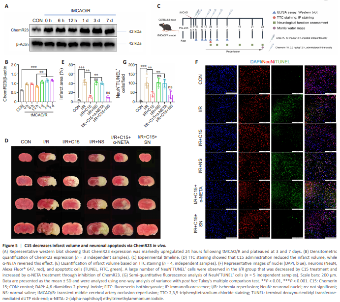 Considering the in vitro results described above, we investigated the antiinflammatory and neuroprotective effects of C15 on mice subjected to I/R injury. To do this, we first assessed ChemR23 expression by western blot at 0, 6, and 12 hours and 1, 3, and 7 days following tMCAO/R. ChemR23 expression increased until 1 day after tMCAO/R, after which it plateaued (Figure 5A and B). Therefore, we investigated the protective effects of C15 on I/R injury and its interaction with ChemR23 at 24 hours post-injury. Before subjecting the mice to tMCAO/R, they were treated with C15 intranasally, as shown in Figure 5C. We assessed the impact of C15 on infarct volume via 2,3,5-triphenyltetrazolium chloride staining. As shown in Figure 5D and E, the percentage of infarct volume out of the total brain volume was 42.76% ± 4.78% in the I/R group, confirming successful establishment of the tMCAO/R model. C15 treatment markedly decreased this percentage to 11.45% ± 2.53%, while α-NETA increased the percentage of infarct volume to 39.74% ± 2.80%. We further explored the effect of C15 on neuronal apoptosis via in vivo double immunofluorescence staining. As shown in Figure 5F and G, the number of apoptotic neurons (NeuN+ TUNEL+ cells) in the I/R group was significantly higher than that seen in the CON group, while the number of apoptotic neurons in the I/R + C15 group was decreased compared with the I/R group. The protective effect of C15 was weakened by treatment with α-NETA. No significant difference was observed in the number of apoptotic neurons between the I/R and I/R + C15 + α-NETA groups.